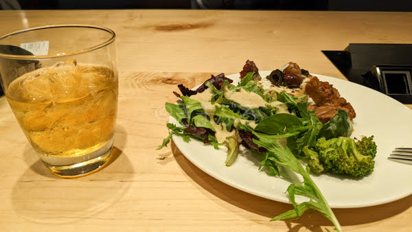 サラダもね、フレッシュでいい感じなんですよ。 ウィスキーもやっすいものじゃなくて、Maker's Markとかが無料で飲めるし。 お昼にステーキとか普通に食べてたのに、時間が経てばお腹が空くのは当たり前。